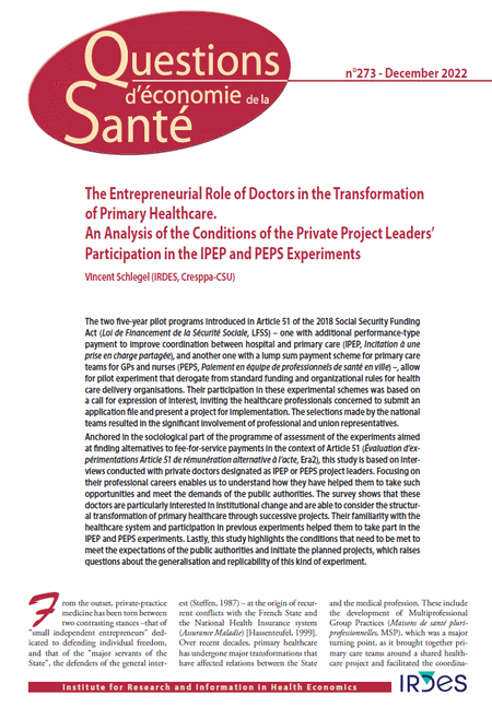 Anchored in the sociological part of the programme of assessment of the experiments aimed at finding alternatives to fee-for-service payments in the context of Article 51 (Évaluation d'expérimentations Article 51 de rémunération alternative à l'acte, Era2), this study is based on interviews conducted with private doctors designated as IPEP or PEPS project leaders. Focusing on their professional careers enables us to understand how they have helped them to take such opportunities and meet the demands of the public authorities.