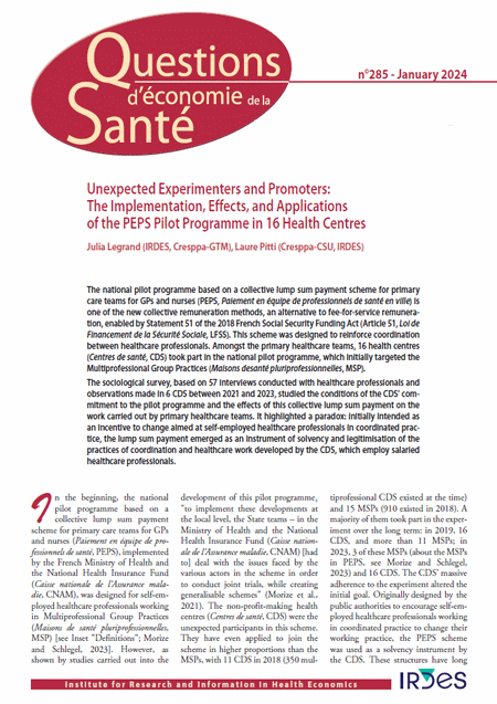 The national pilot programme based on a collective lump sum payment scheme for primary care teams for GPs and nurses (PEPS, Paiement en équipe de professionnels de santé en ville) is one of the new collective remuneration methods, an alternative to fee-for-service remuneration, enabled by Statement 51 of the 2018 French Social Security Funding Act (Article 51, Loi de Financement de la Sécurité Sociale, LFSS). This scheme was designed to reinforce coordination between healthcare professionals. Amongst the primary healthcare teams, 16 health centres (Centres de santé, CDS) took part in the national pilot programme, which initially targeted the Multiprofessional Group Practices (Maisons desanté pluriprofessionnelles, MSP).