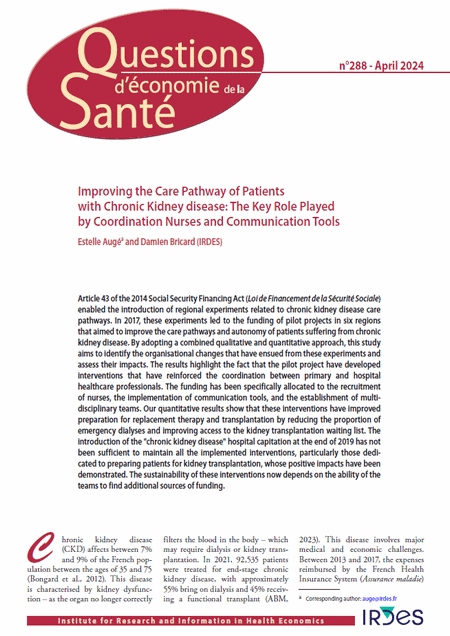 See also Questions d'économie de la santé n° 288 in French: Améliorer la prise en charge des patients insuffisants rénaux chroniques : le rôle majeur des infirmières de coordination et des outils de communication.