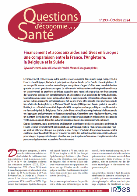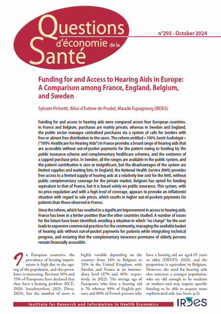 See also Questions d'économie de la santé n° 293 in French: Financement et accès aux aides auditives en Europe : une comparaison entre la France, l'Angleterre, la Belgique et la Suède.