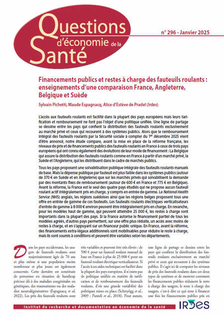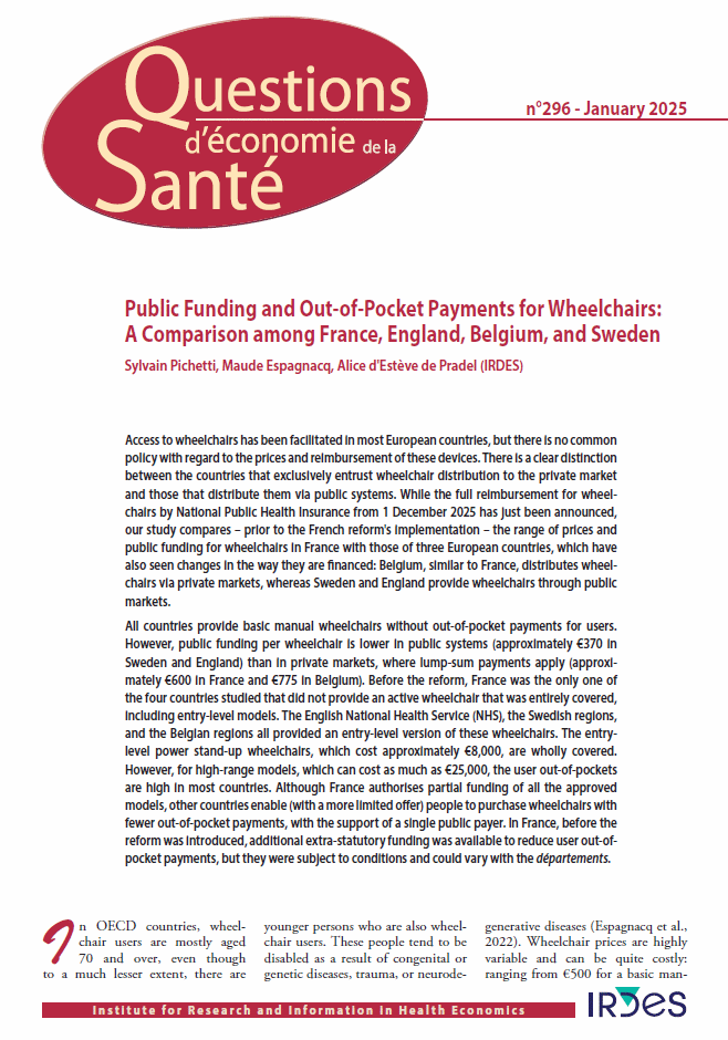 See also Questions d'économie de la santé n° 296 in French: Financements publics et restes à charge des fauteuils roulants : enseignements d'une comparaison France, Angleterre, Belgique et Suède.