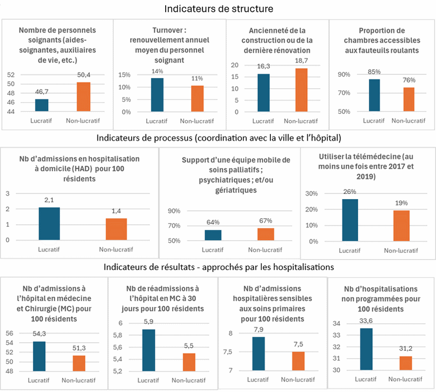 Lecture : Dans la littérature internationale, les indicateurs de qualité puisent leurs racines dans les travaux de Avedis Donabedian qui distingue trois dimensions complémentaires : la structure (ressources matérielles et humaines), le processus (pratiques de soins) et les résultats (impact sur la santé et satisfaction des patients). Selon Donabedian, ces trois éléments sont interdépendants, et une évaluation continue est essentielle pour identifier et corriger les faiblesses pouvant affecter la qualité des soins. Nous présentons ici des exemples d'indicateurs pouvant être calculés à partir de données administratives et d'enquêtes pour chacune de ces dimensions, ainsi que leurs variations entre établissements lucratifs et non lucratifs.