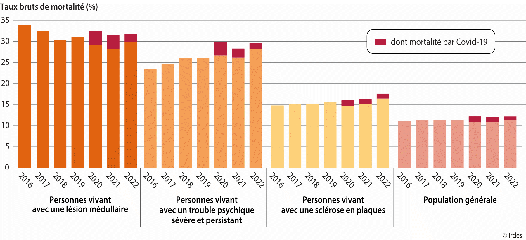 Issu du Questions d'économie de la santé n° 298 : « Un impact variable de la pandémie de Covid-19 sur la mortalité des personnes à risque de handicap : le cas des lésions médullaires, des troubles psychiques sévères et persistants et de la sclérose en plaques » de Duchaine F. (Université de Strasbourg, Irdes), en collaboration avec Espagnacq M. (Irdes), Gandré C. (Irdes), Levy J. (Irdes, Hôpital Raymond Poincaré, UVSQ Paris Saclay) et Regaert C. (Irdes)