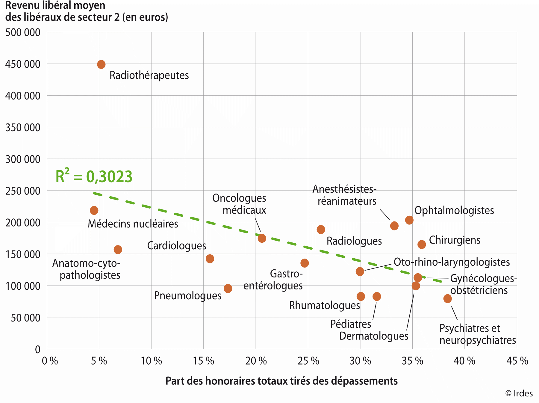 Certaines spécialités médico-chirurgicales et chirurgicales comme les ophtalmologues, les chirurgiens ou les anesthésistes-réanimateurs ont à la fois des revenus élevés et une part élevée des dépassements dans l'ensemble de leurs honoraires.