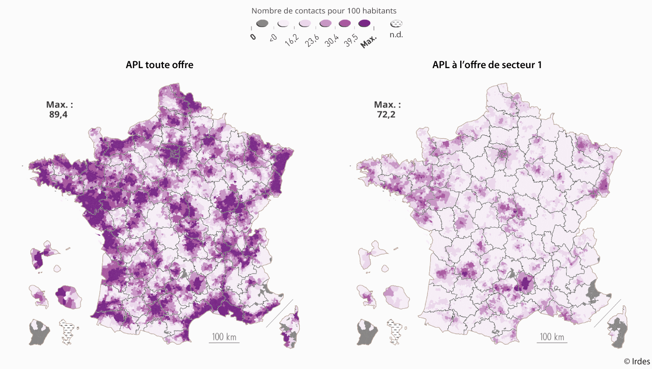 Pour mesurer l'accessibilité aux soins, l'indicateur privilégié, dit d'Accessibilité potentielle localisée (APL), tient compte du niveau d'activité des médecins pour mesurer l'offre de soins et du taux de recours différencié par âge des habitants pour mesurer la demande. Il s'agit d'un indicateur local, calculé au niveau de chaque commune, mais qui considère également l'offre de médecins et la demande des communes environnantes. L'indicateur se lit comme une densité qui rapporte le nombre de contacts disponibles pour 100 habitants de la commune. Cet indicateur, utilisé en routine pour les soins primaires, a été décliné par l'Irdes pour mesurer l'accessibilité aux soins de spécialistes « de ville » dans trois spécialités (ophtalmologues, cardiologues, dermatologues) afin de rendre compte des enjeux de répartition territoriale et de dynamique démographique. L'APL intègre à la caractérisation de l'offre une dimension tarifaire en raison de l'existence d'importants dépassements d'honoraires dans certaines spécialités et dans certaines zones du territoire.