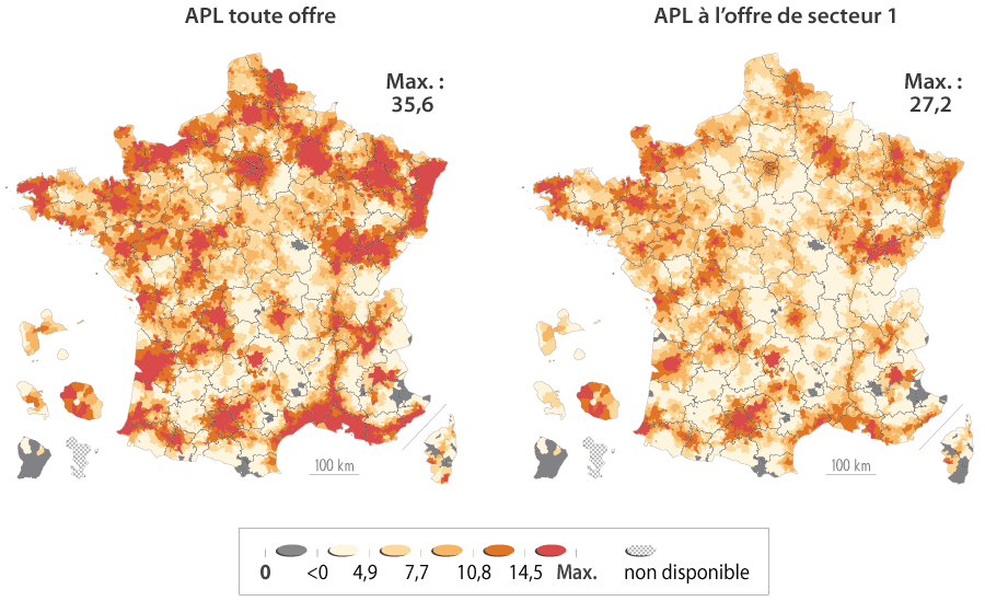 Note de lecture : Pour mesurer l'accessibilité aux soins, l'indicateur privilégié, dit d'Accessibilité potentielle localisée (APL), tient compte du niveau d'activité des médecins pour mesurer l'offre de soins et du taux de recours différencié par âge des habitants pour mesurer la demande. Il s'agit d'un indicateur local, calculé au niveau de chaque commune, mais qui considère également l'offre de médecins et la demande des communes environnantes. L'indicateur se lit comme une densité qui rapporte le nombre de contacts disponibles pour 100 habitants de la commune. Cet indicateur, utilisé en routine pour les soins primaires, a été décliné par l'Irdes pour mesurer l'accessibilité aux soins de spécialistes « de ville » dans trois spécialités (ophtalmologistes, cardiologues, dermatologues) afin de rendre compte des enjeux de répartition territoriale et de dynamique démographique. L'APL intègre à la caractérisation de l'offre une dimension tarifaire en raison de l'existence d'importants dépassements d'honoraires dans certaines spécialités et dans certaines zones du territoire.