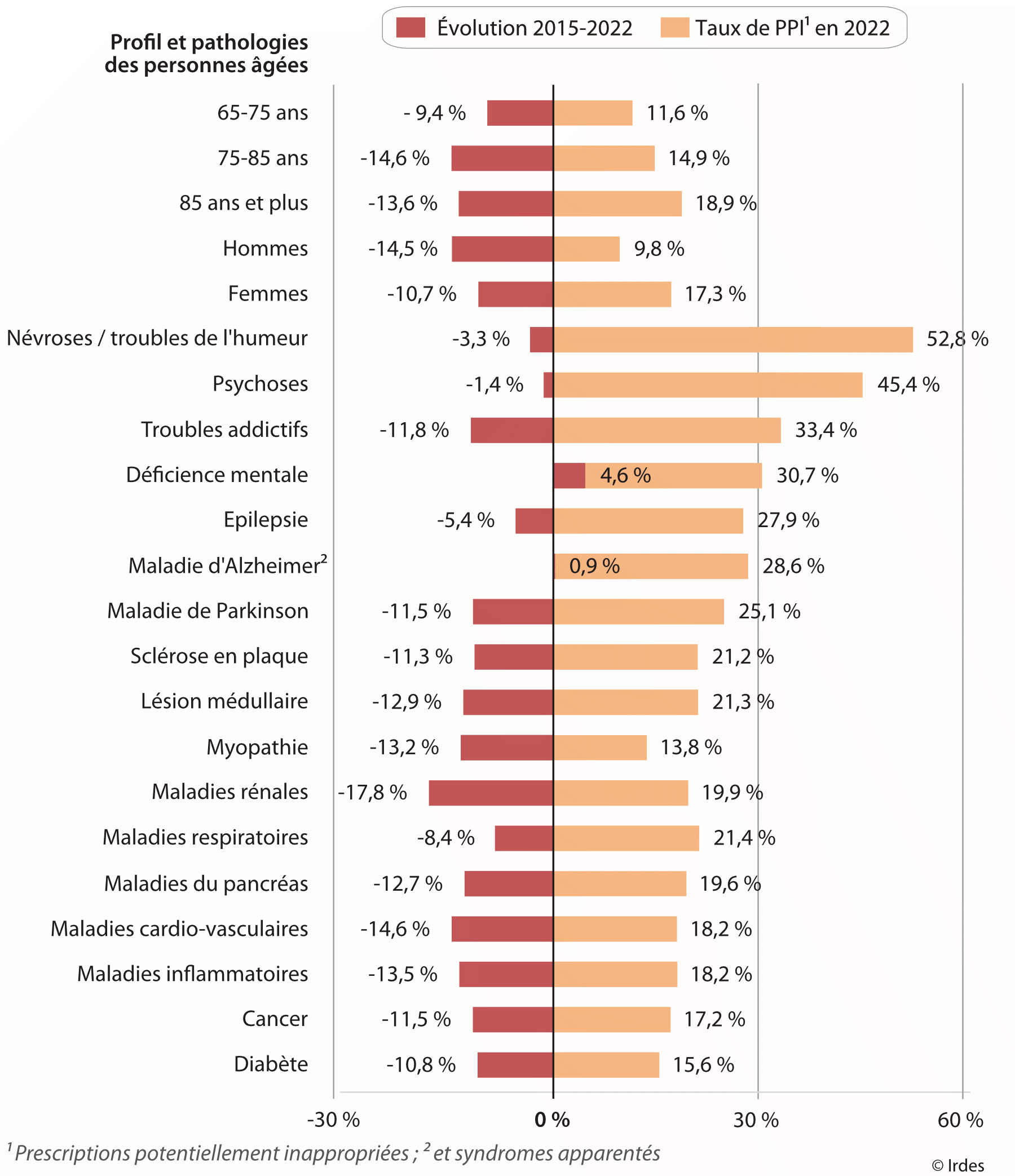 Ainsi en 2022, 52,8 % des personnes âgées de plus de 65 ans présentant des névroses et troubles de l'humeur ont une prescription potentiellement inappropriée de benzodiazépines, cette proportion ne baissant que de 3,3 % entre 2015 et 2022 ; de même pour les personnes atteintes de psychose : 45,4 % ont une prescription potentiellement inappropriée, avec une baisse de 1,4 % entre 2015 et 2022. En comparaison, ce taux a baissé de 17,8 % sur la même période pour les personnes atteintes de maladies rénales.