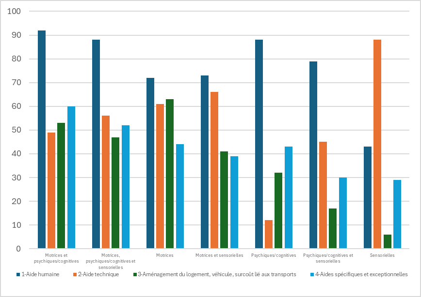 Lecture : En dehors des enquêtés qui ont exclusivement des troubles sensoriels, plus de 70 % ont au moins une notification d'aide humaine dans le cadre de leur accord PCH. Inversement, les enquêtés avec des troubles sensoriels ont très fréquemment des accords d'aides techniques (88 %), contrairement à ceux qui ont exclusivement des troubles psychique, intellectuel ou cognitif (12 %). La présence de limitations motrices est en lien avec le fait d'avoir un accord d'aide pour faire face au surcoût lié aux transports. La répartition des accords de "dépenses spécifiques ou exceptionnelles liées au handicap" est moins marquée par la nature des limitations fonctionnelles.