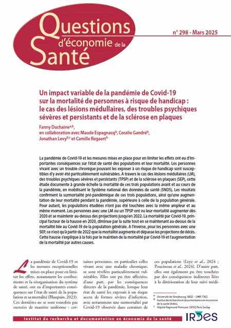 La pandémie de Covid-19 et les mesures mises en place pour en limiter les effets ont eu d'importantes conséquences sur l'état de santé des populations et leur mortalité. Les personnes vivant avec un trouble chronique pouvant les exposer à un risque de handicap sont susceptibles d'y avoir été particulièrement vulnérables. A travers le cas des lésions médullaires (LM), des troubles psychiques sévères et persistants (TPSP) et de la sclérose en plaques (SEP), cette étude documente à grande échelle la mortalité de ces trois populations avant et au cours de la pandémie, en mobilisant le Système national des données de santé (SNDS). Les résultats confirment la surmortalité pré-pandémique de ces trois populations, ainsi qu'une augmentation de leur mortalité pendant la pandémie, supérieure à celle de la population générale. Pour autant, les populations étudiées n'ont pas été touchées avec la même ampleur et au même moment. Les personnes avec une LM ou un TPSP ont vu leur mortalité augmenter dès 2020 et se maintenir au-dessus des projections jusqu'en 2022. La mortalité par Covid-19, principal facteur de la hausse en 2020, diminue par la suite tout en se maintenant au-dessus de la mortalité liée au Covid-19 de la population générale. A l'inverse, pour les personnes avec une SEP, ce n'est qu'à partir de 2022 que la mortalité augmente et dépasse les projections de décès. Cette hausse s'explique à la fois par le maintien de la mortalité par Covid-19 et l'augmentation de la mortalité par autres causes.