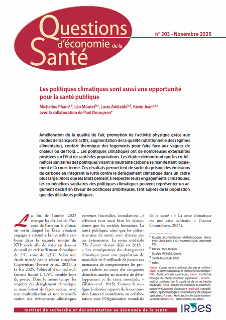 Amélioration de la qualité de l'air, promotion de l'activité physique grâce aux modes de transports actifs, augmentation de la qualité nutritionnelle des régimes alimentaires, confort thermique des logements pour faire face aux vagues de chaleur ou de froid… Les politiques climatiques ont de nombreuses externalités positives sur l'état de santé des populations. Les études démontrent que les co-bénéfices sanitaires des politiques visant la neutralité carbone se manifestent localement et à court terme. Ces résultats permettent de sortir du prisme des émissions de carbone en intégrant la lutte contre le dérèglement climatique dans un cadre plus large. Alors que les Etats peinent à respecter leurs engagements climatiques, les co-bénéfices sanitaires des politiques climatiques peuvent représenter un argument décisif en faveur de politiques ambitieuses, tant auprès de la population que des décideurs politiques.
